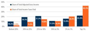 The chart below illustrates the differential one would expect to see associated with a progressive tax system. Interestingly, since 2001 the share of income tax paid by the rich has increased from 33% to 42%, while the share paid by the bottom 50% has dropped from 5% to 2%.